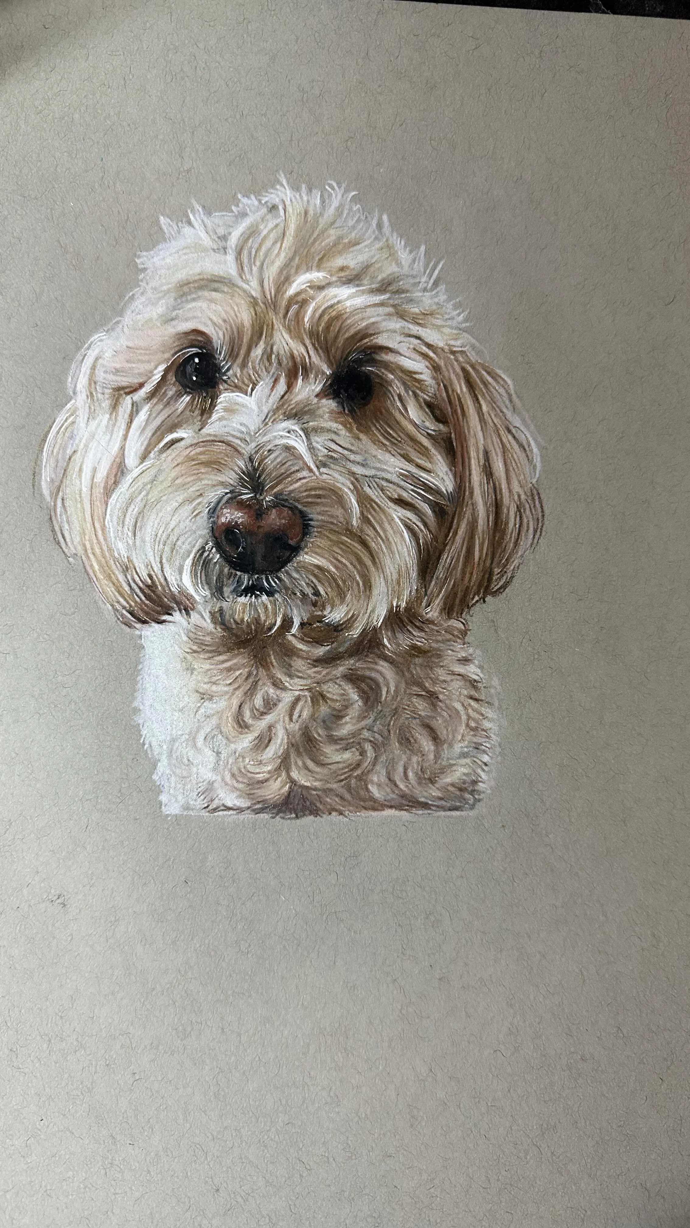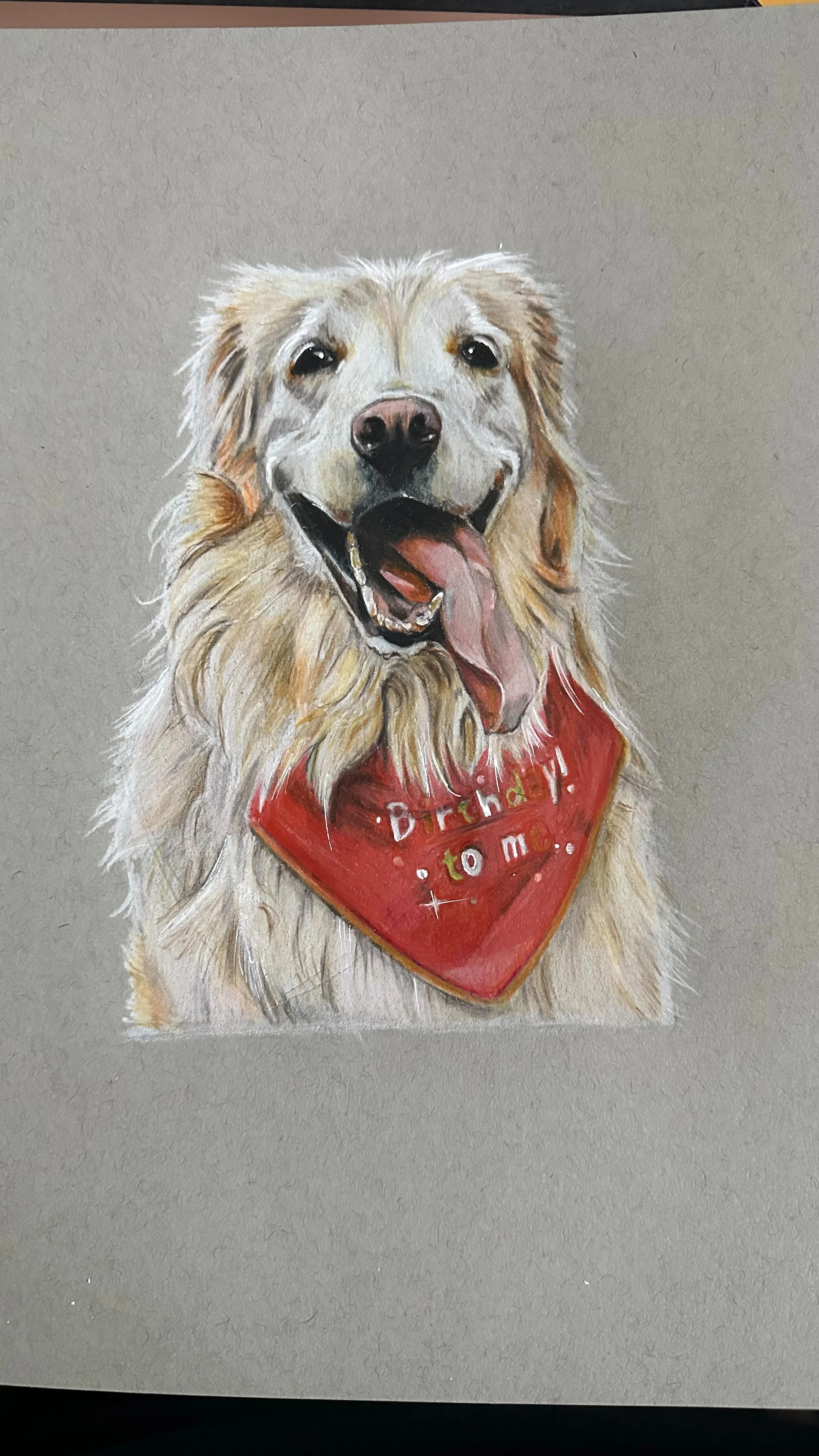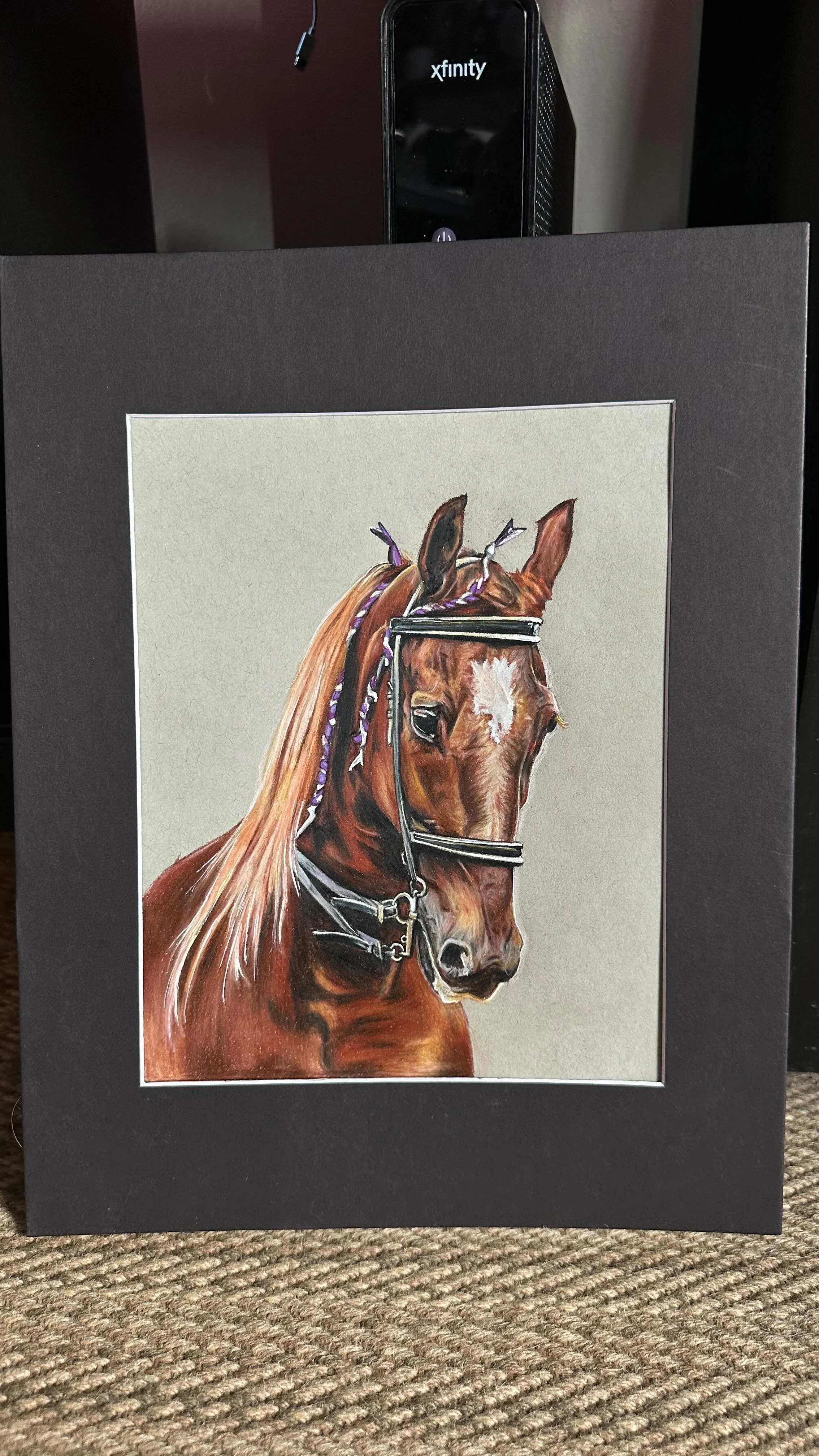 All portraits are focused on your pet’s face and done in colored pencil on grey paper with a black mat frame. The frame is lightly taped on so you can remove it and put it in your preferred frame. You may add on a simple or detailed background, your pet’s name, or choose to have your pet’s full body included (add ons are an additional cost). Typical turn around is 4-8 weeks depending on size.