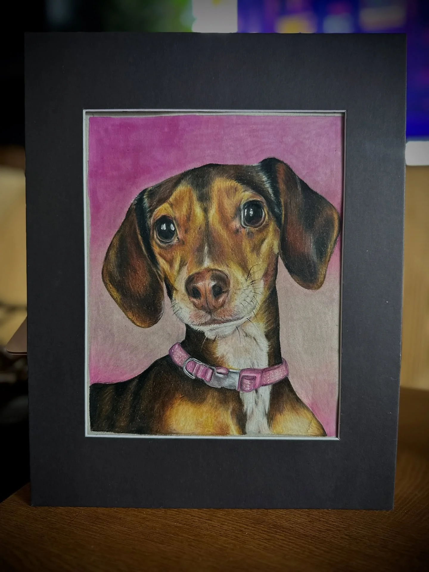 All portraits are focused on your pet’s face and done in colored pencil on grey paper with a black mat frame. The frame is lightly taped on so you can remove it and put it in your preferred frame. You may add on a simple or detailed background, your pet’s name, or choose to have your pet’s full body included (add ons are an additional cost). Typical turn around is 4-8 weeks depending on size.